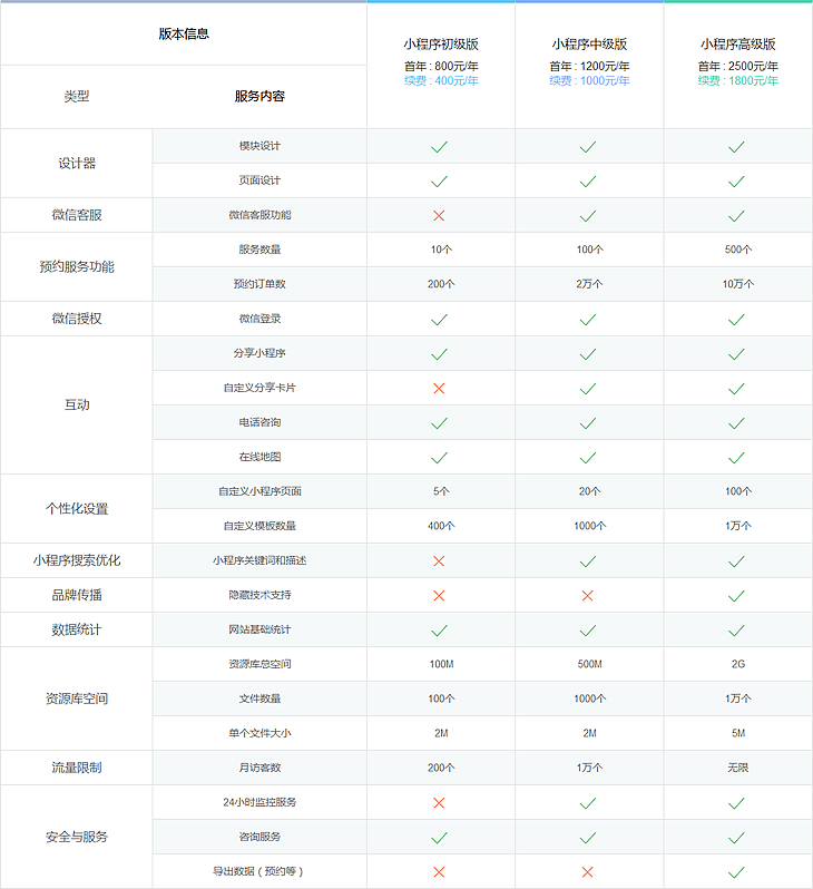 根據(jù)功能不同,我公司小程序有三個版本,價格分別為:800元(續(xù)費400元),1200元(續(xù)費1000元),2500元(續(xù)費1800元),以上價格為已有認(rèn)證微信公眾號的報價,如需代理開通微信公眾號首年另加500元 詳細(xì)功能介紹 >>
